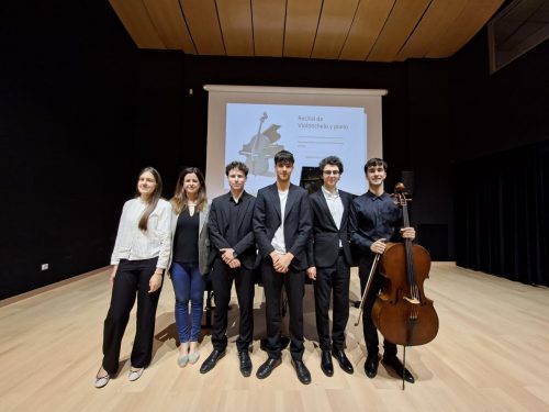 De izquierda a derecha (los tres pianistas: Isabel Cascales Martínez, Marina Martínez Pastor -profesora-, José Ibáñez de Vicente – Yagüe y Hugo Nicolás Bochaca, Rafael Jiménez Alarcón – pianista acompañante – y violonchelo Darío López Vicente – Spiteri)